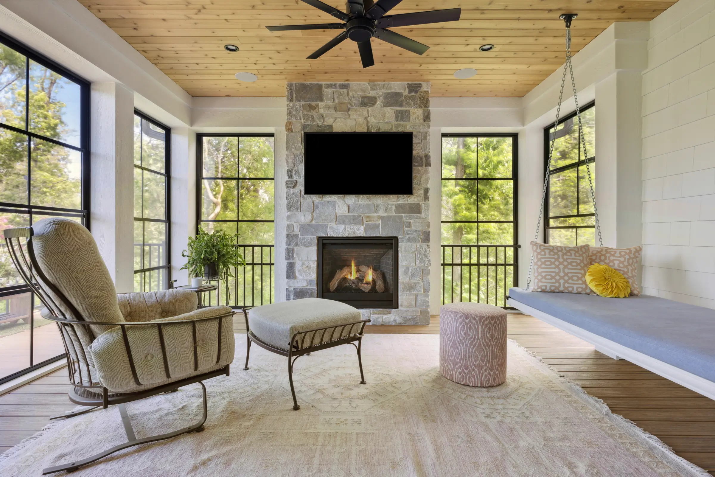 The main level boasts a great room with a fireplace, a chef’s kitchen with Wolf appliances, and a butler’s pantry. The primary suite includes a fireplace, tray ceilings, and a luxurious bathroom with a soaking tub and marble shower. A screen porch with a stone fireplace leads to a spacious deck.