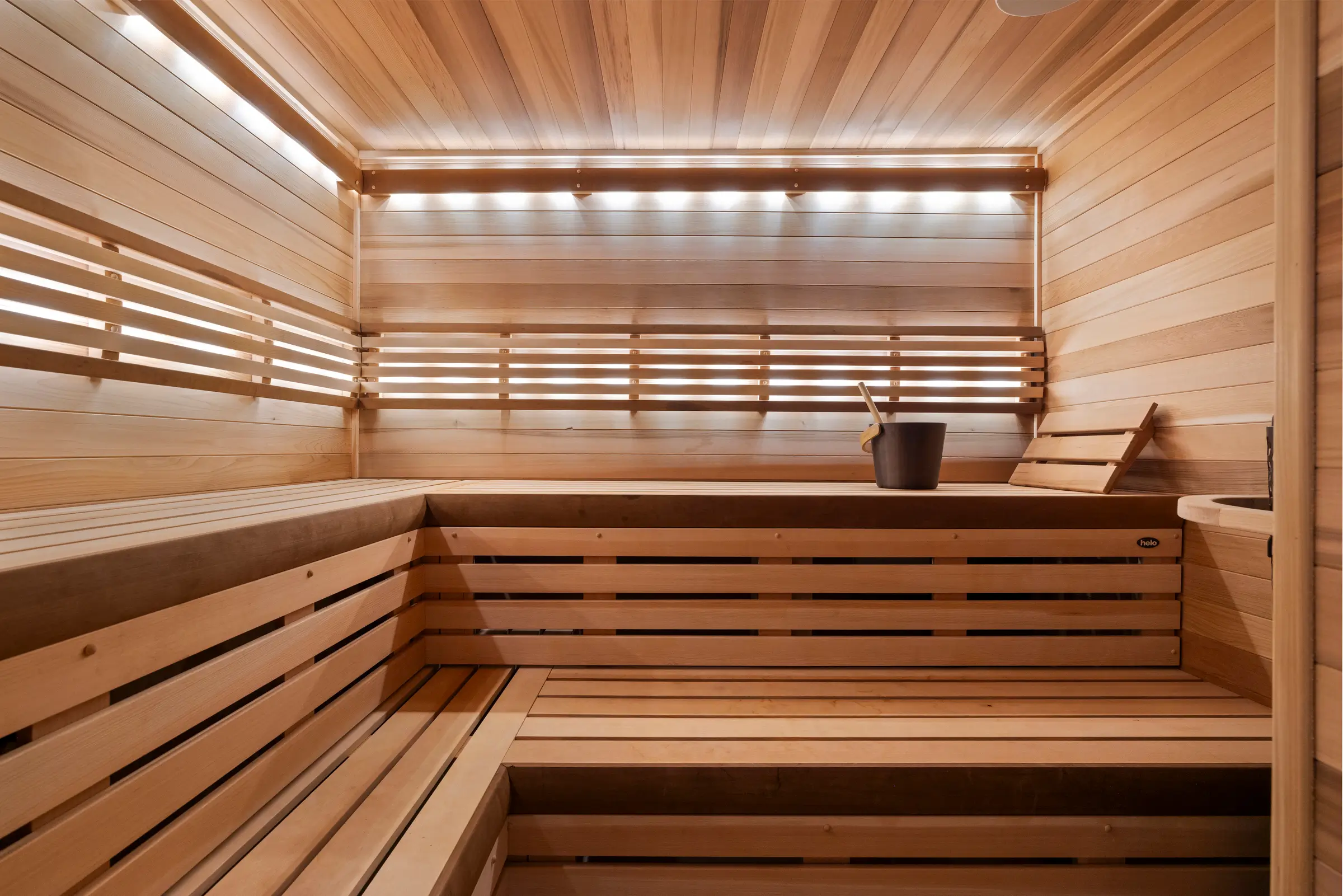 The lower level features an entertainment space with a custom fireplace surround, walk-up bar, and sauna. Two bedrooms, a full bathroom, and additional custom finishes complete the space.
