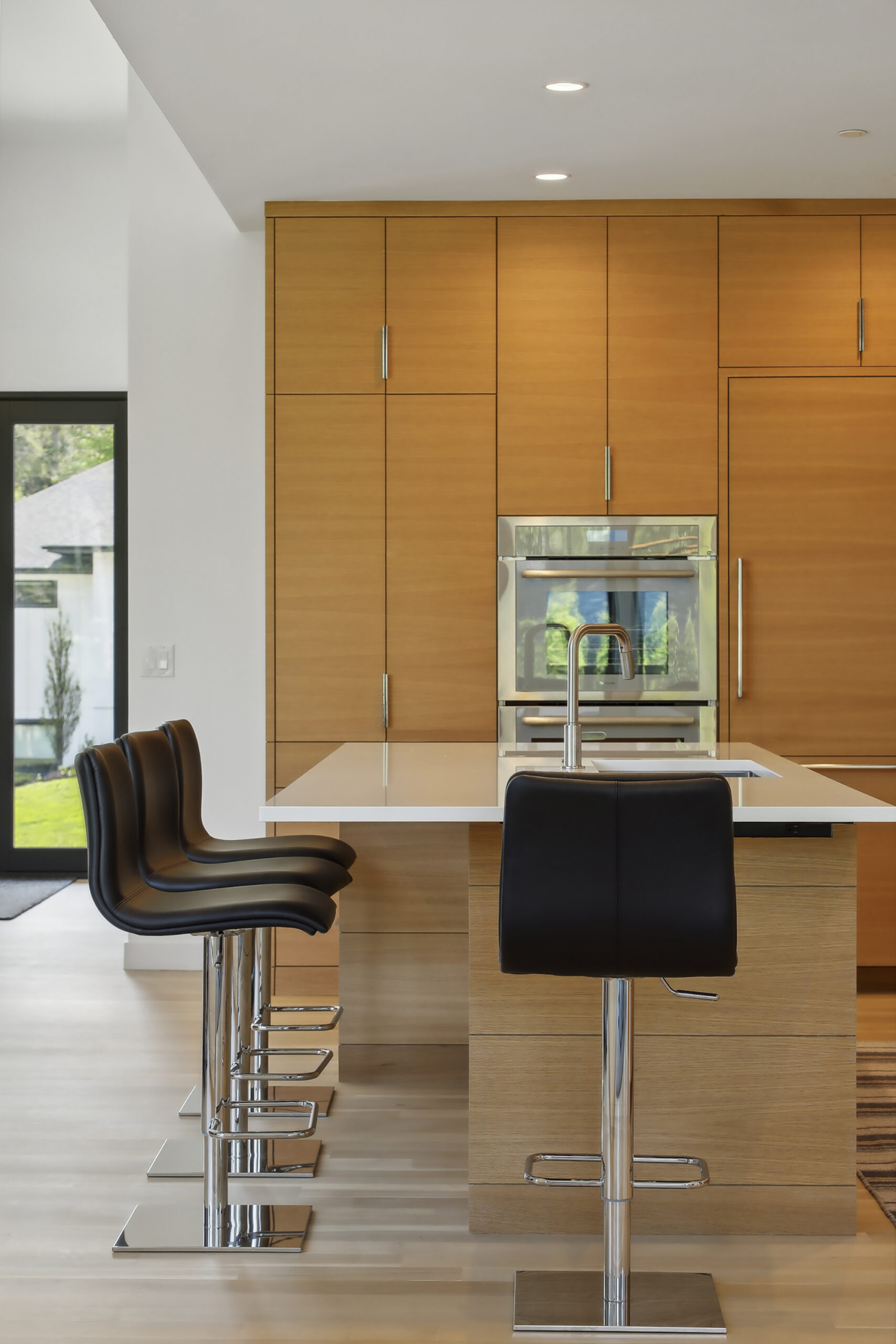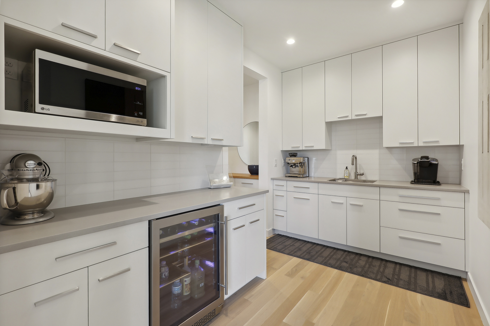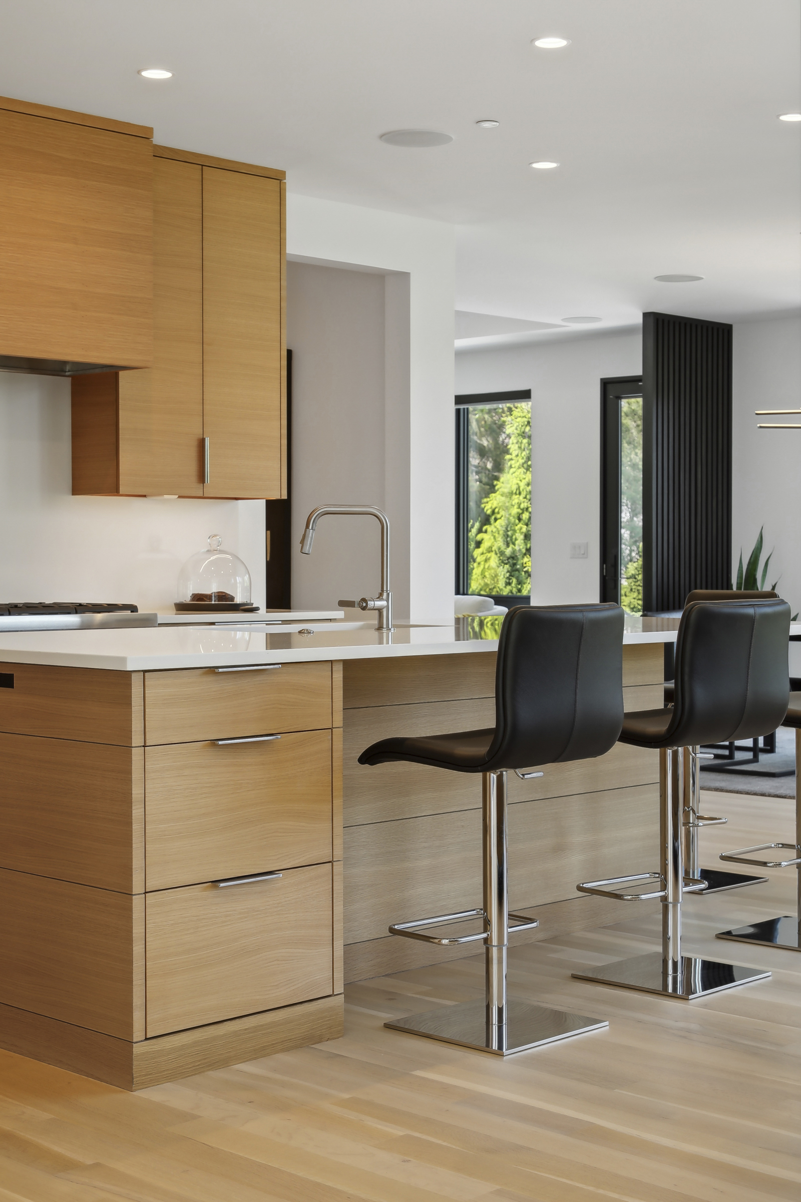 The gourmet kitchen is exceptional in every way with grain matched white oak cabinets and high-end appliances.
