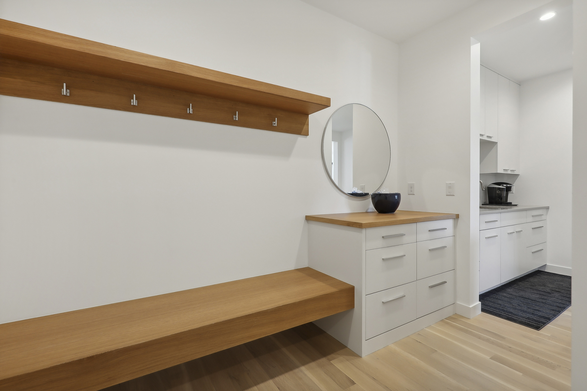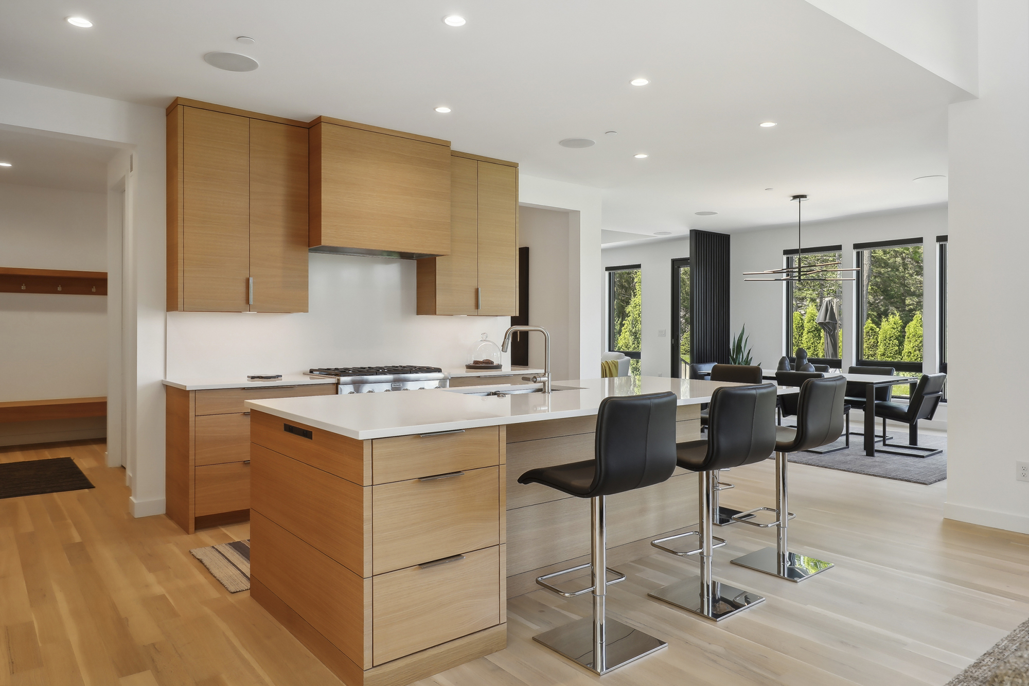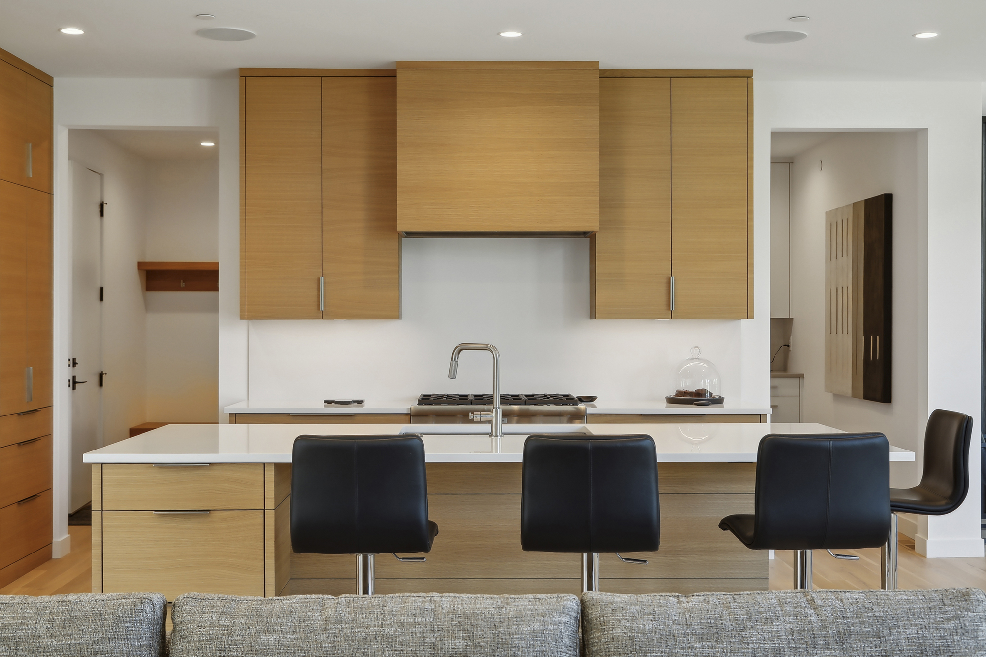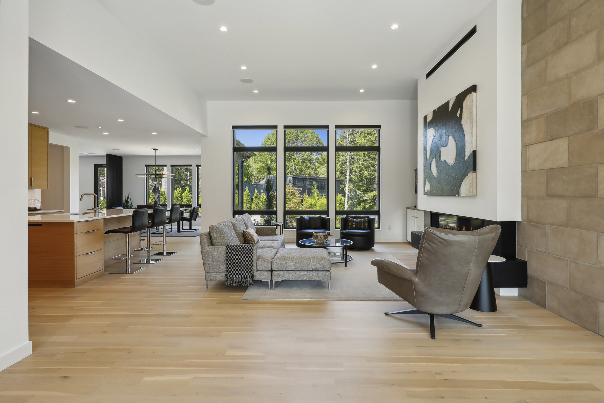 The gourmet kitchen is exceptional in every way with grain matched white oak cabinets and high-end appliances.