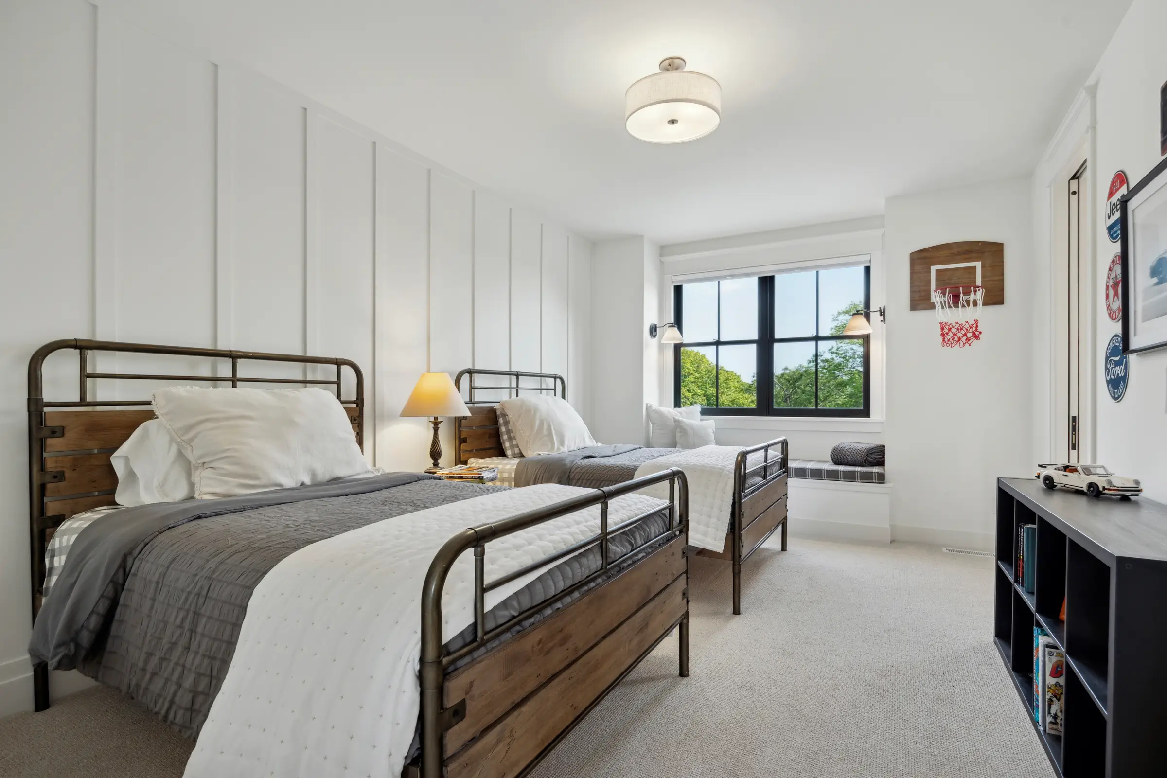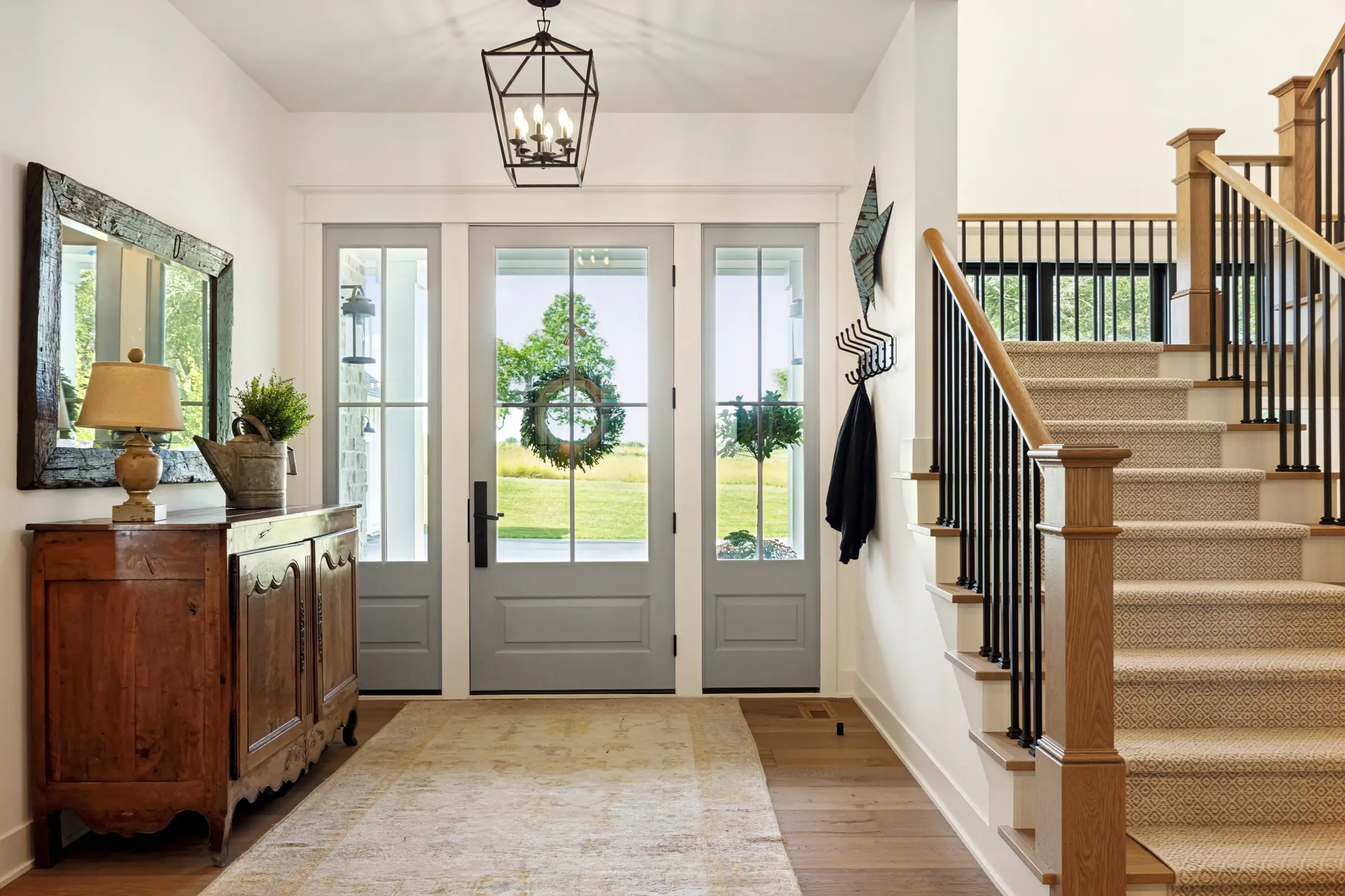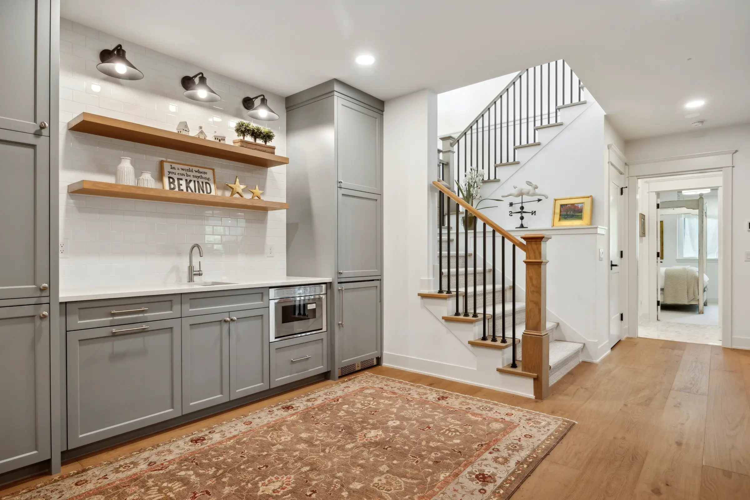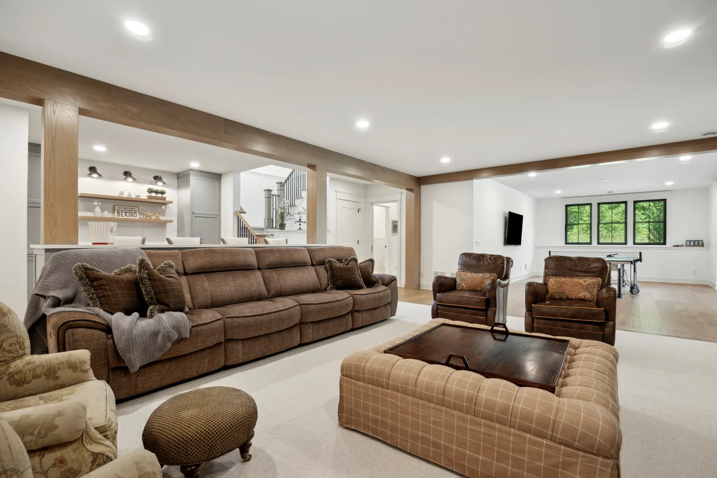 Touches of blue, the homeowner’s favorite color, tie the entire design together – appearing in the mudroom, office, kitchen enamel finishes, basement bar, and even in the front door. Solid wood stairs with a soft runner, Marvin windows with tailored black-and-white trim, and cozy wood accents in the lower-level TV area complete the look.