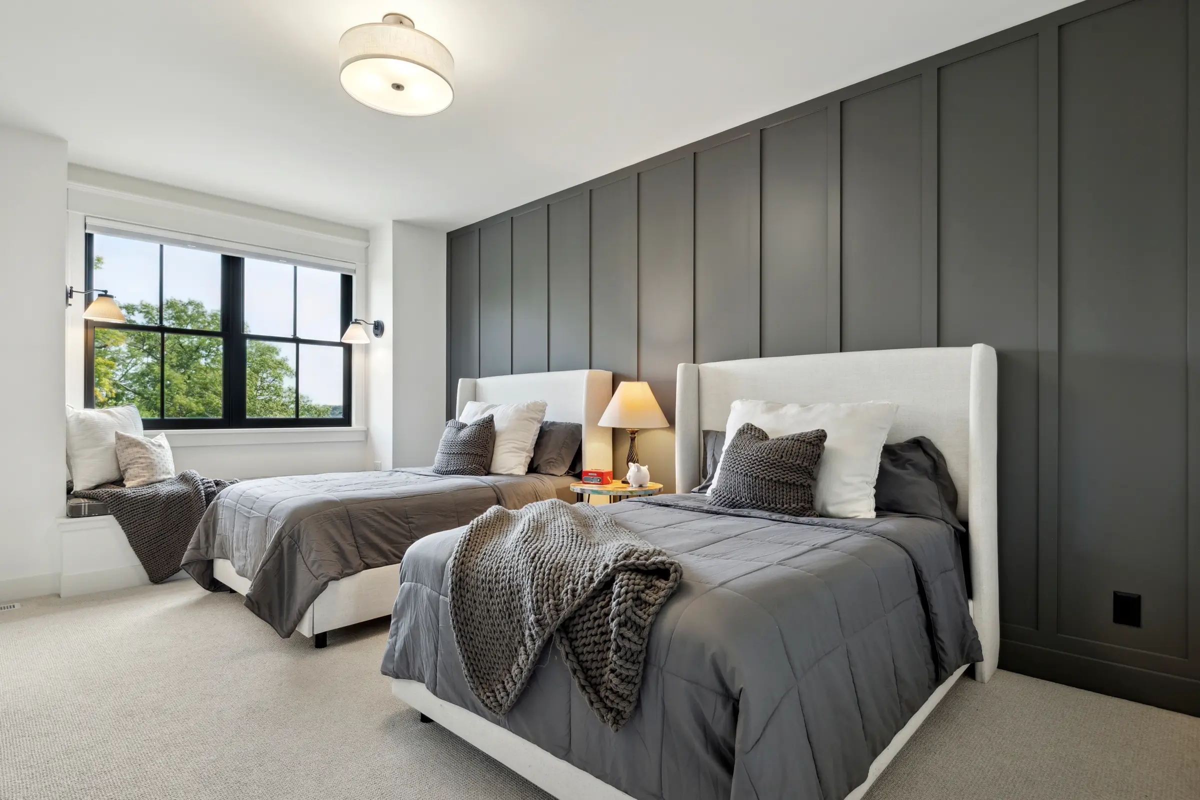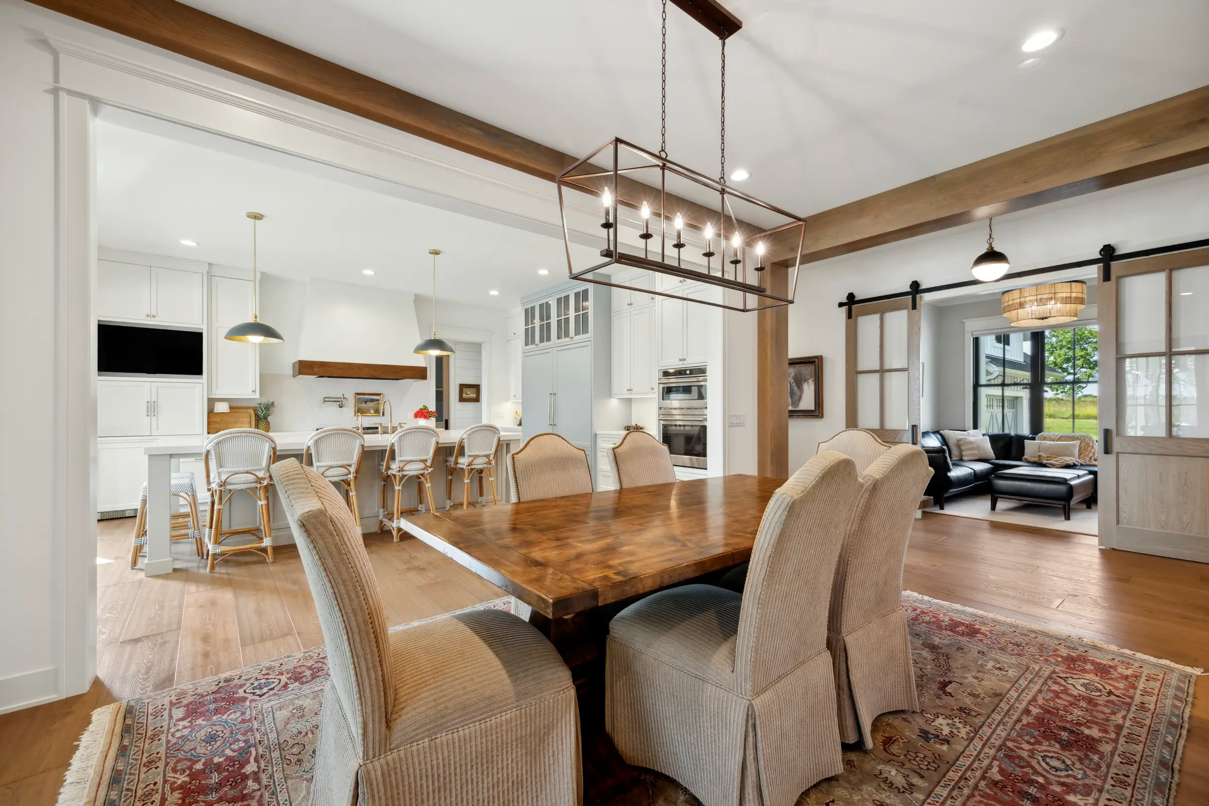 Set on a few peaceful acres with lake access, this home blends elevated farmhouse comfort with modern French country charm. Every space was designed for connection and hospitality. The thoughtful floor plan makes it easy to gather and host large family get-togethers, whether it’s dinner around the oversized kitchen island, cocktails at the lower-level bar, or quiet conversations in the screened porch that looks out over the trees.